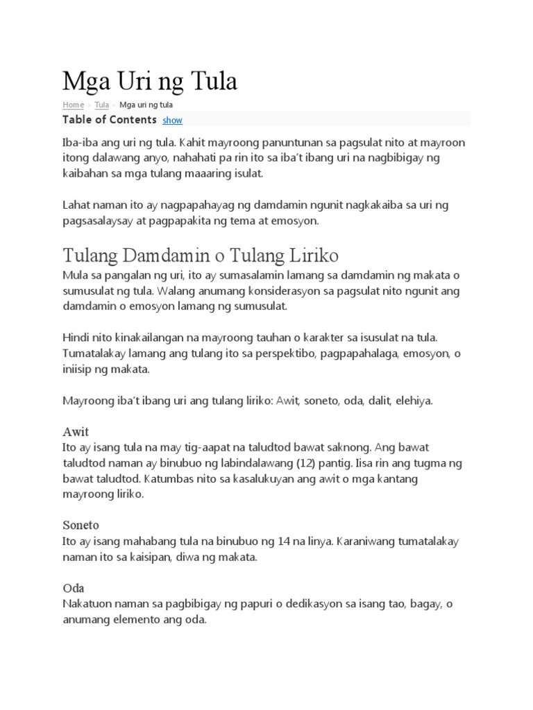 MGA URI NG TULANG PASALAYSAY Ito ay isang awit na isinasaliw noon sa isang sayaw ngunit nang kalaaunay nakilala bilang tulang kasaysayan na may wawaluhin o aaniming pantig sa isang paraang payak at tapatan. Ang mag-ina ay dumalaw sa. Kanilang kamag-anak na may sakit sa Laguna 3.