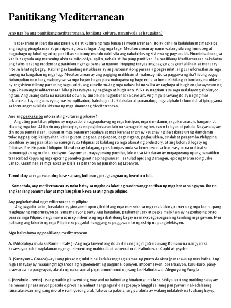 Ang pagkakatulad ng mediterranean at pilipino. Anyo at Uri ng Panitikan. Panitikan ng Sinaunang Mediterranean ay naging batayan ng ibat ibang uri ng from A EN ENGLISH LI at Central Panay College of Science and Technology - Kalibo Aklan.