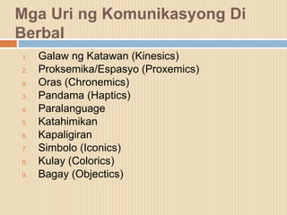 10 uri ng di berbal na komunikasyon. Pagbasa Komunikasyon sa Akademikong Filipino. 4 KINESICS- galaw ng katawanmovement of body. Ibat ibang uri ng di-berbal na komunikasyon 1.